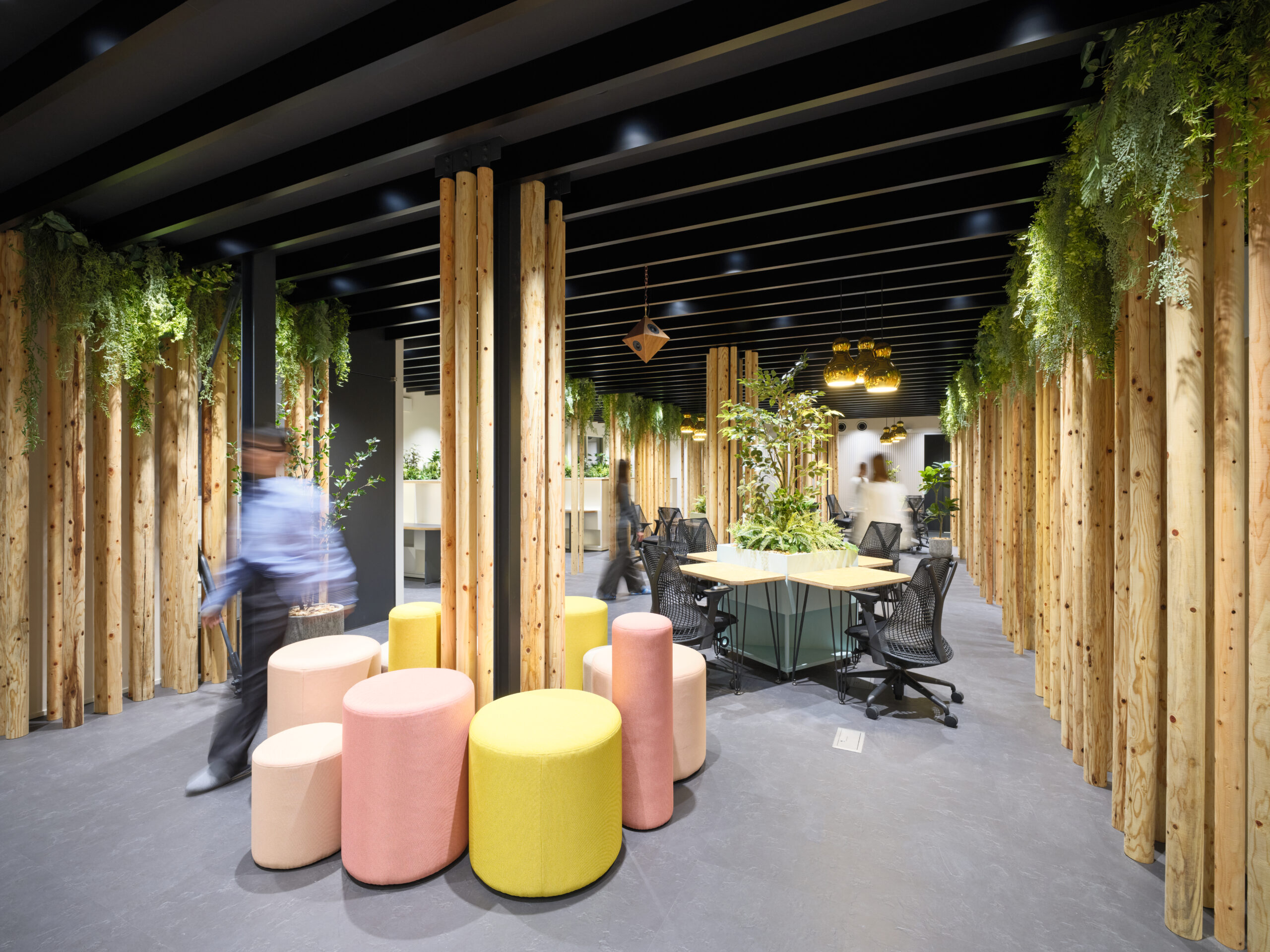 新オフィスは、木立に包まれた小さな森のようなオフィスをイメージし、
